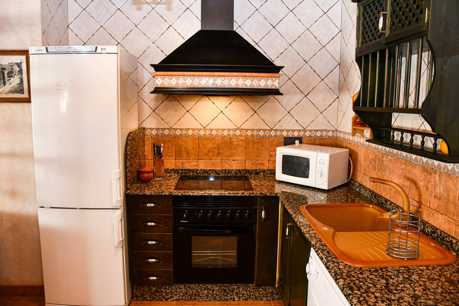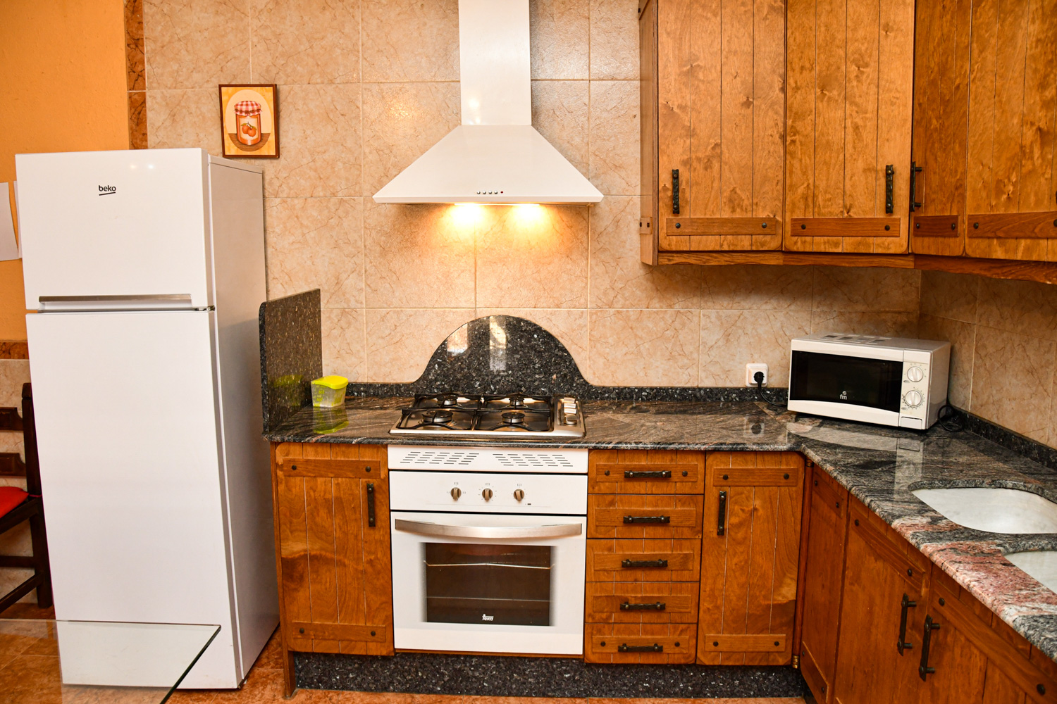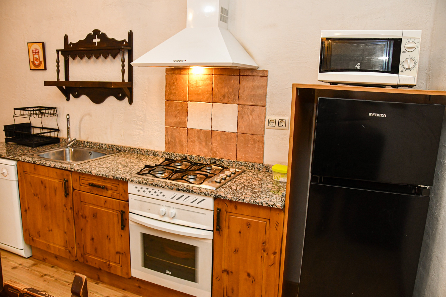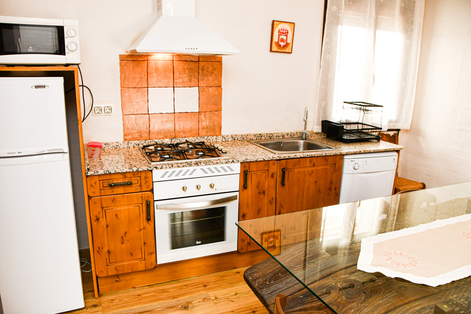 – La cocina está totalmente equipada con cocina de butano, frigorífico, microondas, tostadora, batidora, cafetera, … y todo el menaje completo.